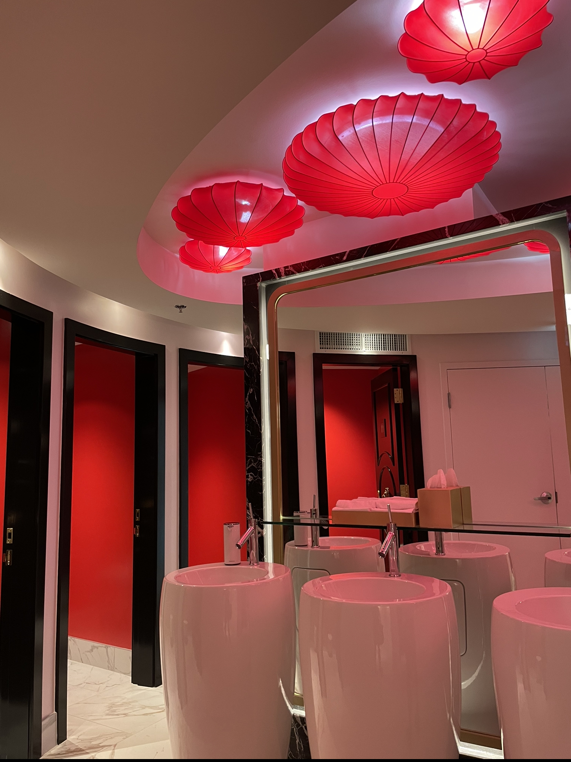 Take a bathroom selfie to end all bathroom selfies in the second-floor unisex washrooms. With black marble, floor-to-ceiling backlit mirrors, brass accents, lion’s head brass knockers on each stall, and mood lighting emitted from Chinese night market-inspired red lanterns, you’ll be taking any excuse to hit the restroom.